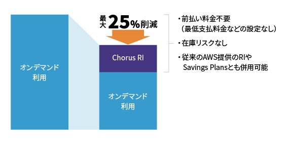 「Chorus RI」は上記の様なケースにおいてもRIによる割引を受けられるように前払いや余剰リスクなどの制約事項を解消したC-Chorus独自の低リスクRIサービスです。従来からのオンデマンド、RIに加えて「Chorus RI」を提供する事で新しい契約の選択肢を増やし、多くの企業がAWSをより効果的に活用していけるようにサポートします。