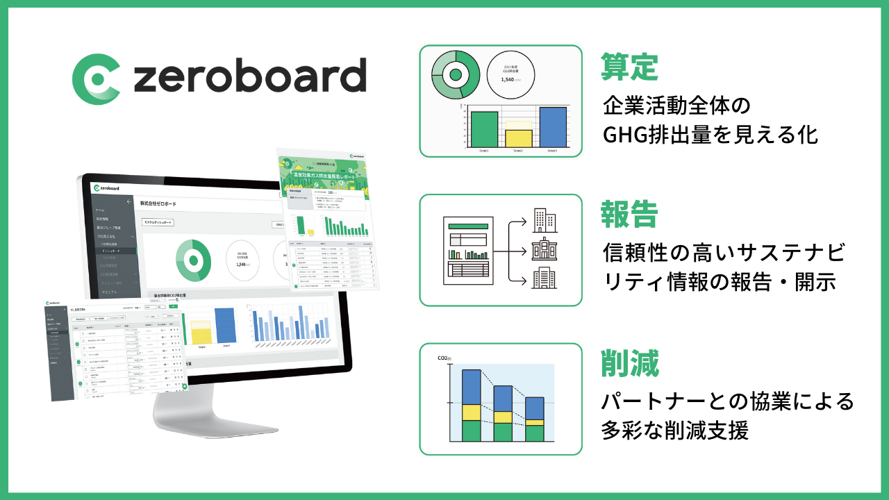 「zeroboard」は、脱炭素経営パートナーとしてGHG(温室効果ガス)排出量算定・開示・削減までを支援する一気通貫ソリューションです。企業活動やサプライチェーン由来のGHG排出量をクラウド上で算定と可視化を行い、課題に合わせたGHG削減ソリューションを提供することで、企業の脱炭素経営を支援しています。