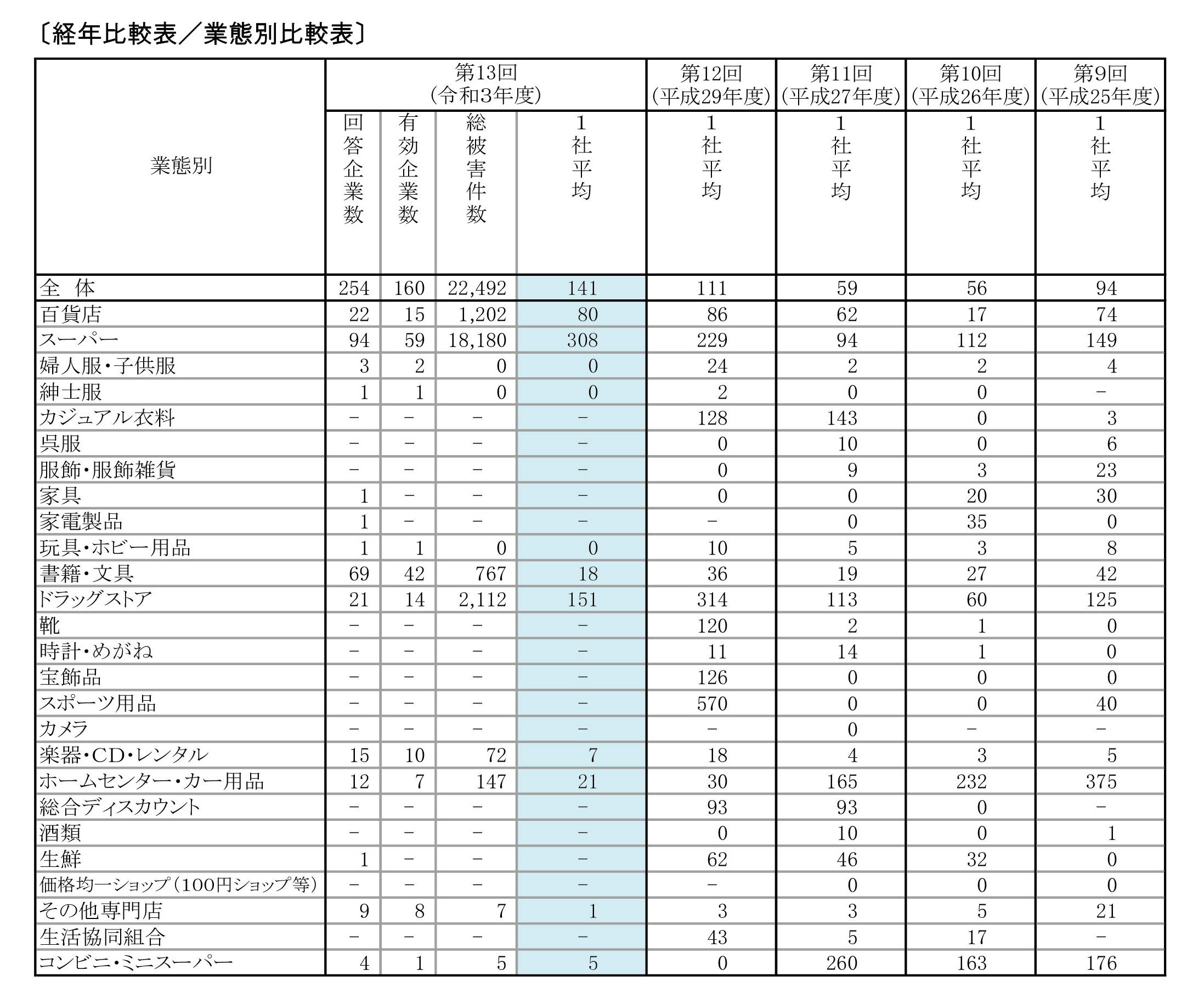 また、万引き犯罪被害の件数については有効回答160社の総被害件数が22,492件、業界平均が141件となっており、平均件数の多い業態は、スーパー(308件)、ドラッグストア(151件)、百貨店(80件)、ホームセンター・カー用品(21件)、書籍・文具(18件)の順となっています。