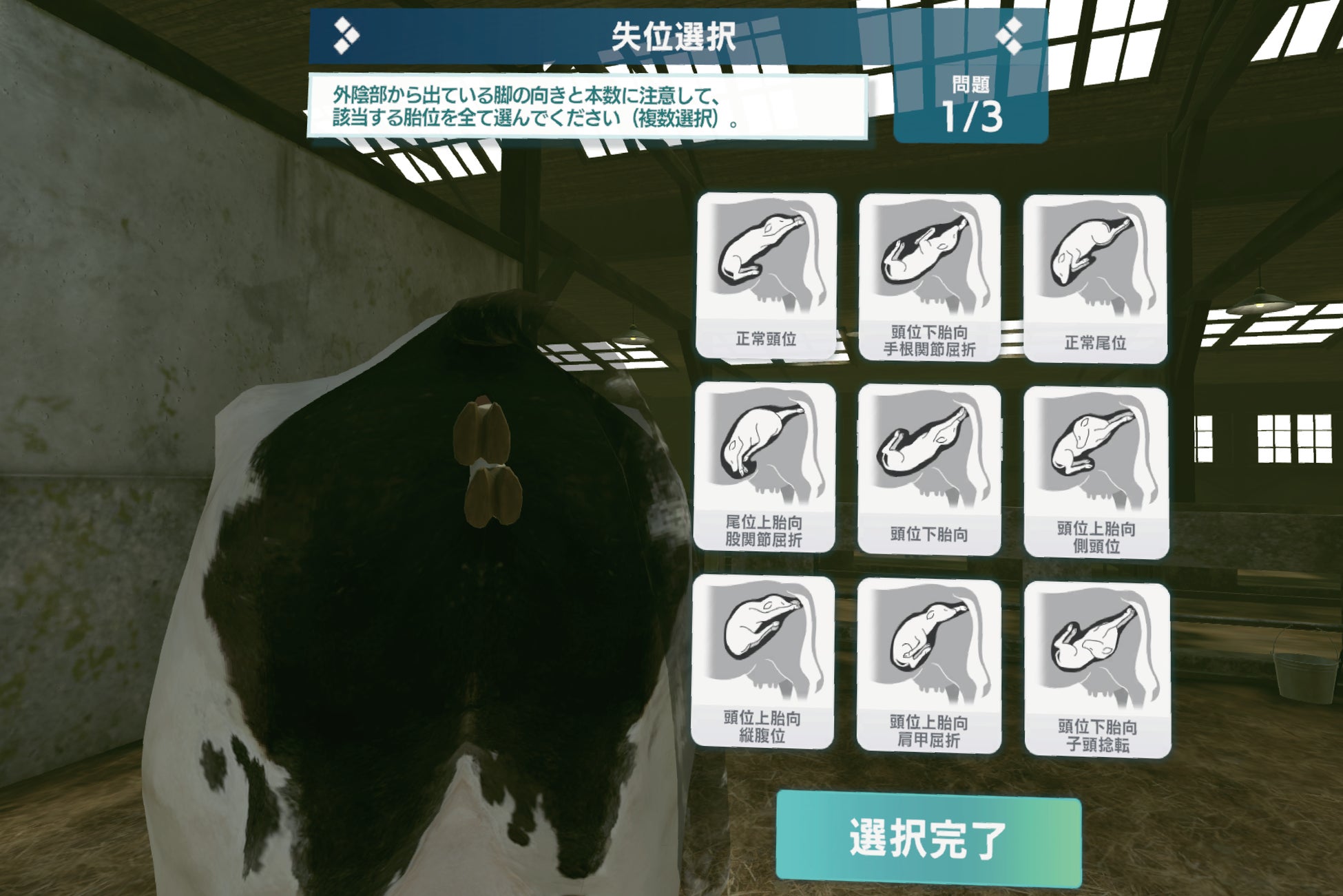 今回新たに開発した「VETS VR~牛の分娩介助~」は、実際の現場と同じように「失位の推論」や「失位の整復」から「出産」までのプロセスを学習できるソフトです。