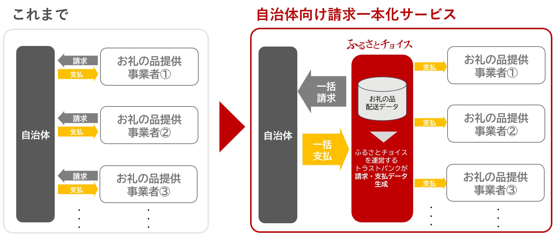 これまで自治体は、ふるさと納税のお礼の品提供事業者に対し、それぞれ請求書を受け取り、支払業務を行っており、提供事業者が増えるほど自治体の請求支払業務に負担がかかっていました。「自治体向け請求一本化サービス」は、トラストバンクがお礼の品の配送データをもとに、月末締め・翌月末払いでトラストバンクから事業者に対しお礼の品の代金を支払い、自治体に対しては、トラストバンクが各事業者に支払った合計金額を一括して請求する仕組みです。これにより、自治体は請求元と支払先が一本にまとまり、請求支払に関する業務負担の削減につながります。