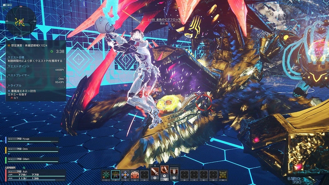 「想定演習:未確認領域A16」に比べて安定した地形のため落下の危険は少なくなりますが、時間経過でブラストチャージサインが外周に出現するため、立ち回る位置をバランスよく切り替えることが重要となります。これまでと同様にモバイルキャノンがクエスト中で1度だけ使えるため、タイミングよく活用して大量のクエストポイント入手を狙いましょう。