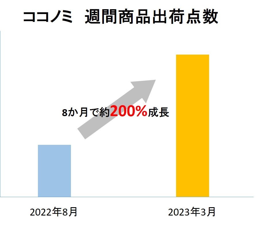 ココノミは2017年にサービスを開始して以来、一貫して野菜の定期宅配サービスを行ってきました。2022年からは、オーガニック食材・無添加食材を含む加工品・冷凍食品の取り扱いを増やしたことで、お客様からも好評をいただき、約8か月で週の出荷点数・売上高を約200%成長させることに成功いたしました。