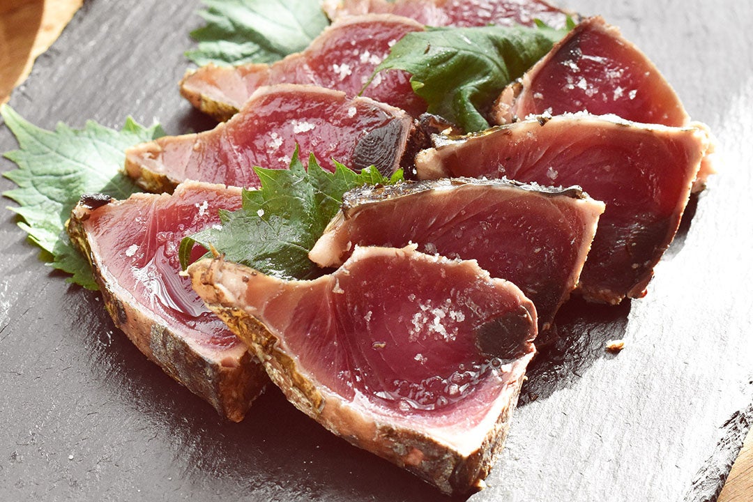 一本釣りで水揚げされた秋の戻り鰹を鮮度を損なわぬよう 船内凍結し、水揚げ後 -40~-50℃の超低温で保管。機械化により今では少なくなった職人が、一節一節丹精込めて焼き上げる 土佐の伝統製法の「完全ワラ焼き」にこだわっており、使用する米ワラは 高知県四万十川流域の米ワラを使用。焼き上げてすぐ急速冷凍・真空パックしました。流水解凍をしてから、添付の完全天日塩で「塩タタキ」を、自家製ぽん酢でオーソドックスな「鰹のタタキ」をお楽しみいただけます。