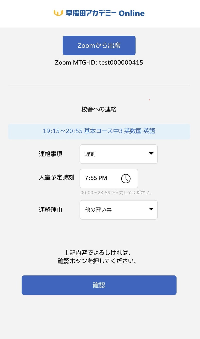 また、授業を欠席・遅刻する際、これまではお電話にてご連絡をいただいておりましたが、「早稲田アカデミーOnline」の「校舎への連絡」ボタンからもご連絡いただけるようになりました。