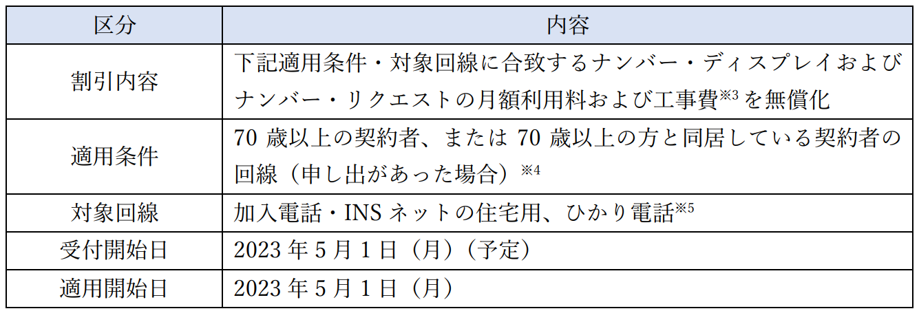 70 歳以上の契約者または 70 歳以上の方と同居している契約者の回線を対象として、ナンバー・ディスプレイおよびナンバー・リクエストの月額利用料および工事費を無料とします。