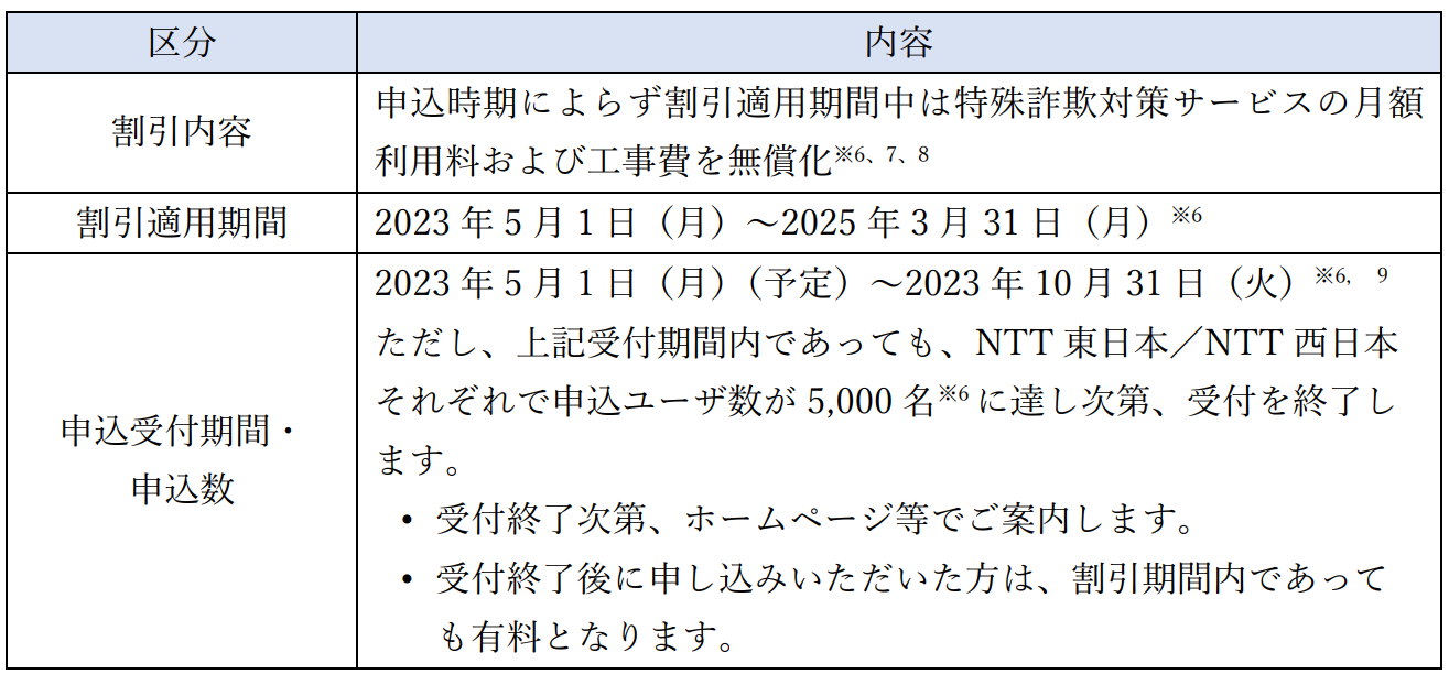 特殊詐欺対策サービスの月額利用料および工事費を、申込受付期間・申込数を限定して※6一定期間無料とします。