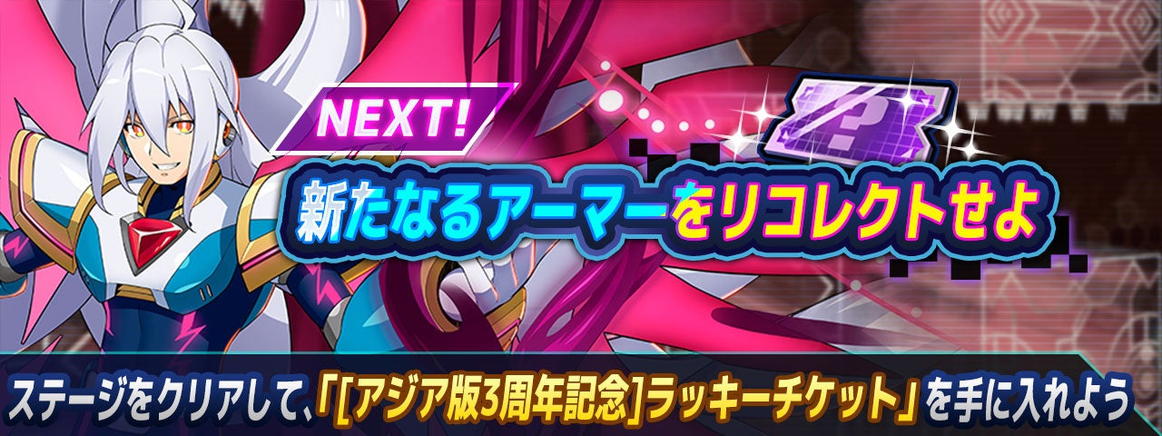 4月19日(水)12:00まで「 [アジア版3周年記念]ラッキーチケット」で起動できる「[アジア版3周年記念]ラッキーカプセル」開催!ラッキーチケットは、開催中のイベントステージ「NEXT!新たなるアーマーをリコレクトせよ」と「[アジア版3周年記念]ログインイベント」で入手することができます!