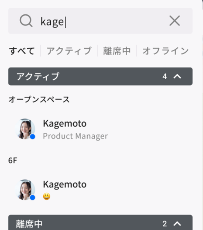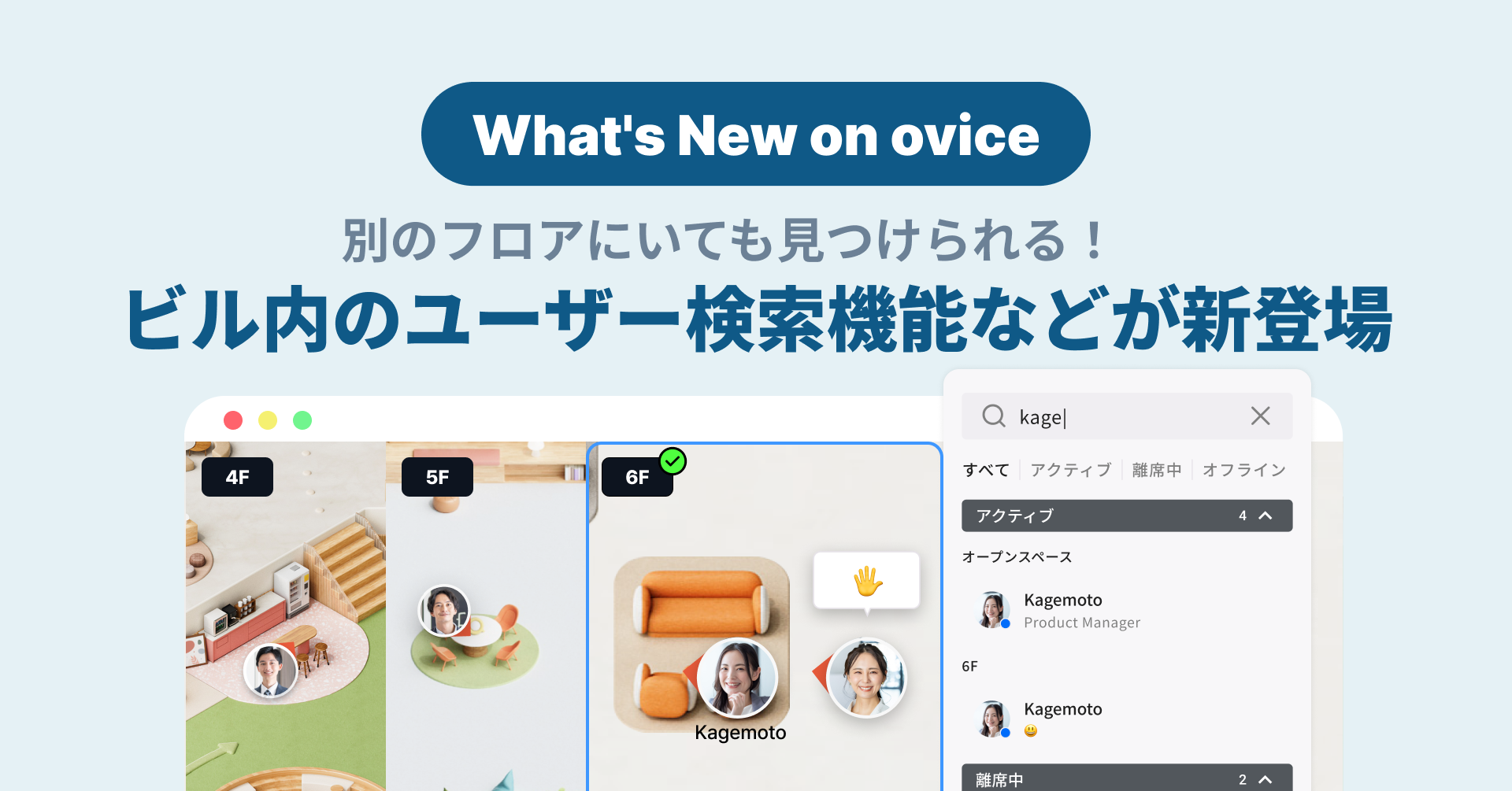 oviceでは、契約中の複数スペースを重ねビル構造にすることで、スペース間を自由に行き来できるようになります。これまでユーザー検索で表示されるのは同じスペースにいる人のみでしたが、今回同じ階層構造(ビル)内での検索が可能になりました。これにより、誰がどのフロアにいるのかに加え、オープンスペースにいるのか、会議室にいるのかなどその人の状態まで分かるため、より簡単に仲間を見つけられ、話しかけて良い状態なのか判断しやすくなりました。
