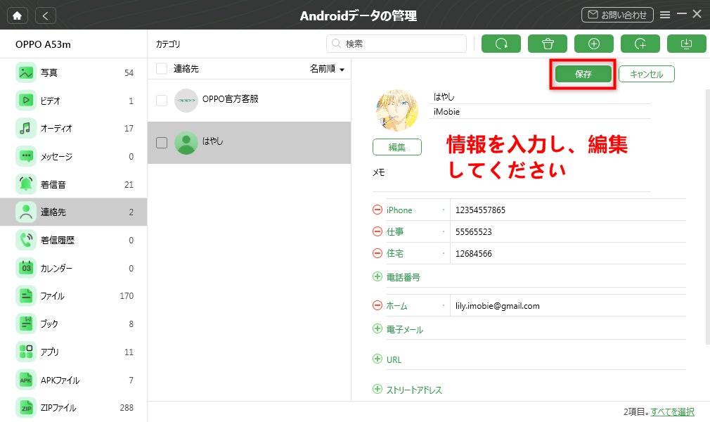 Step 4.編集・追加が終わったら、「保存」ボタンをクリックすると、新しい電話帳がAndroidスマホに保存されました。
