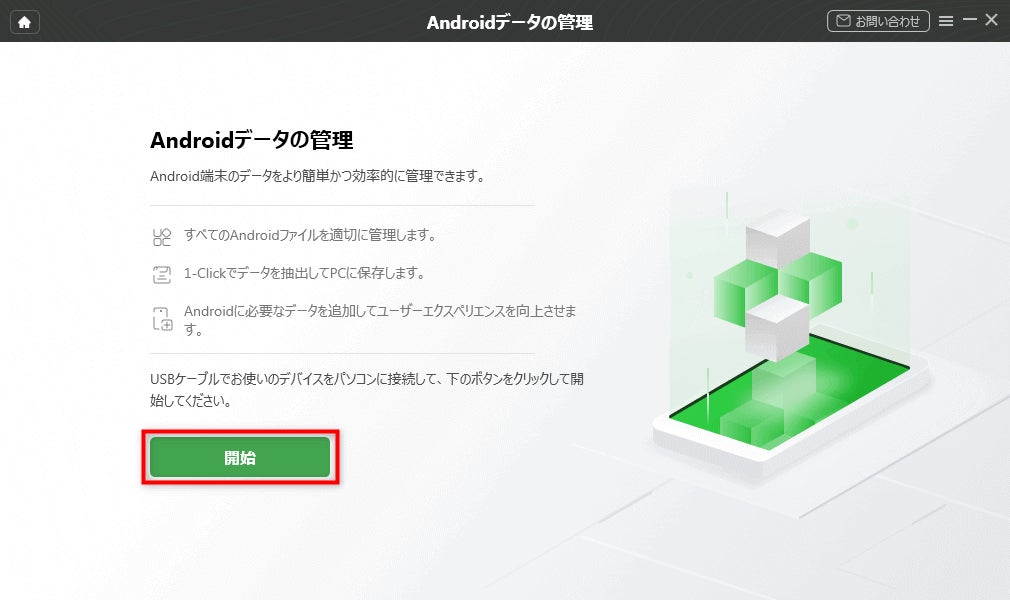 Step 1.DroidKitを起動し、ホーム画面から「Androidデータ管理」機能をクリックします。USBケーブルでスマホをコンピューターに接続し、「開始」ボタンをクリックします。