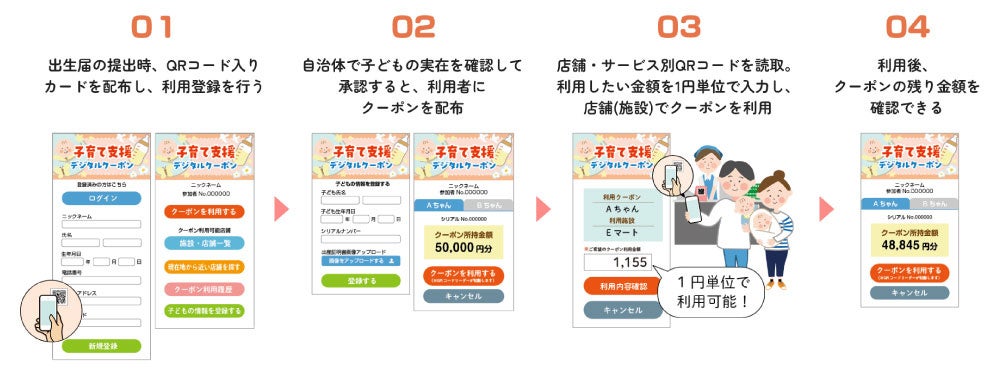 「デジタル子育て支援クーポン」は、地域の子どもの成長に応じて「出産支援」「育児支援」「習い事支援」の3つのクーポンで行政サポートを提供するサービスです。デジタル認証で不正利用を抑制し、子育て世帯に絞った経済的支援を行えます。