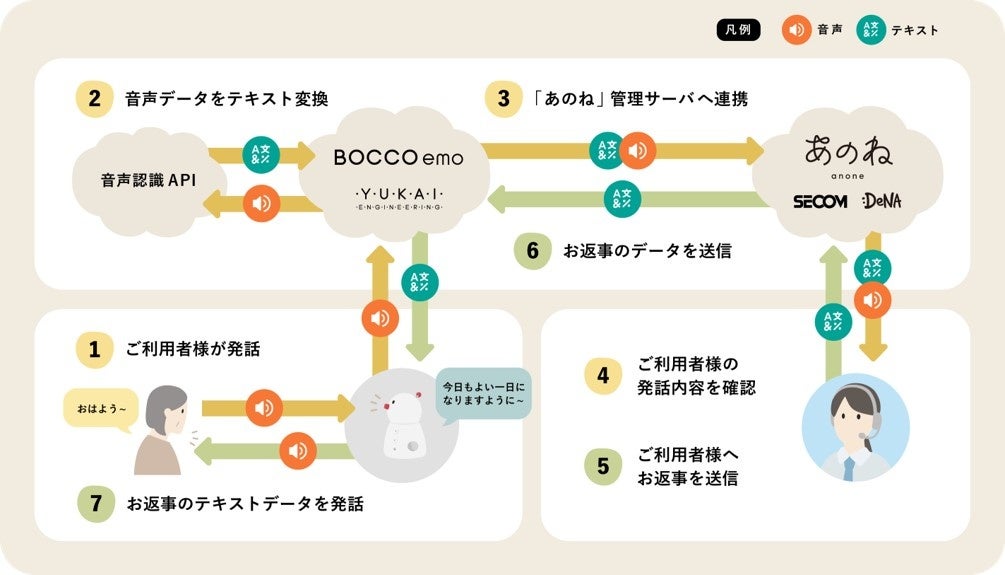 ご利用者が「BOCCO emo」に吹き込んだ音声データは、ユカイ工学のクラウド環境を通じて「あのね」のクラウド環境(セコムとDeNAで共同開発)に連携。音声データとテキストデータをコミュニケーターが確認し、返信テキストを送信すると「BOCCO emo」が音声に変換してご利用者に応答します。
