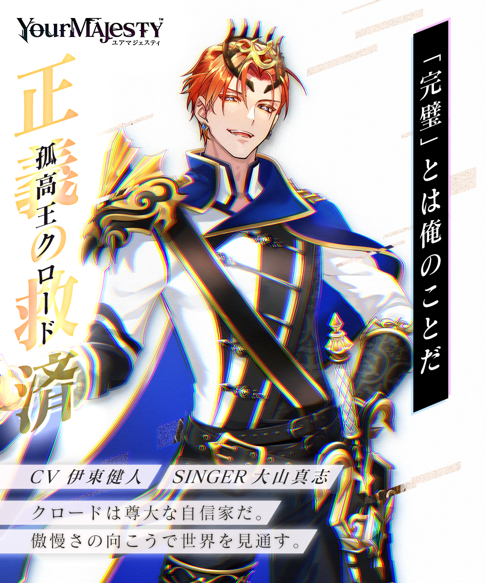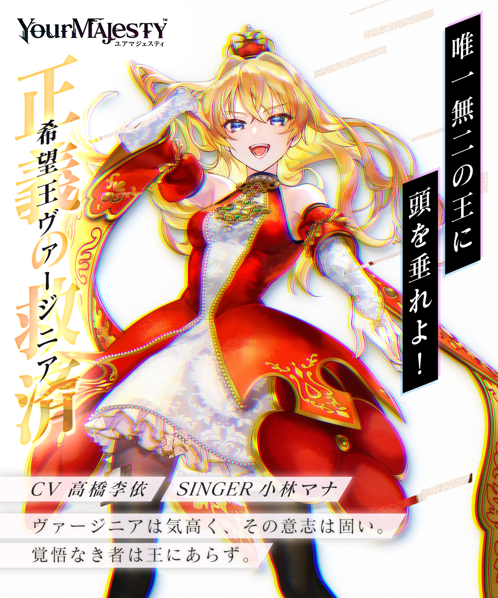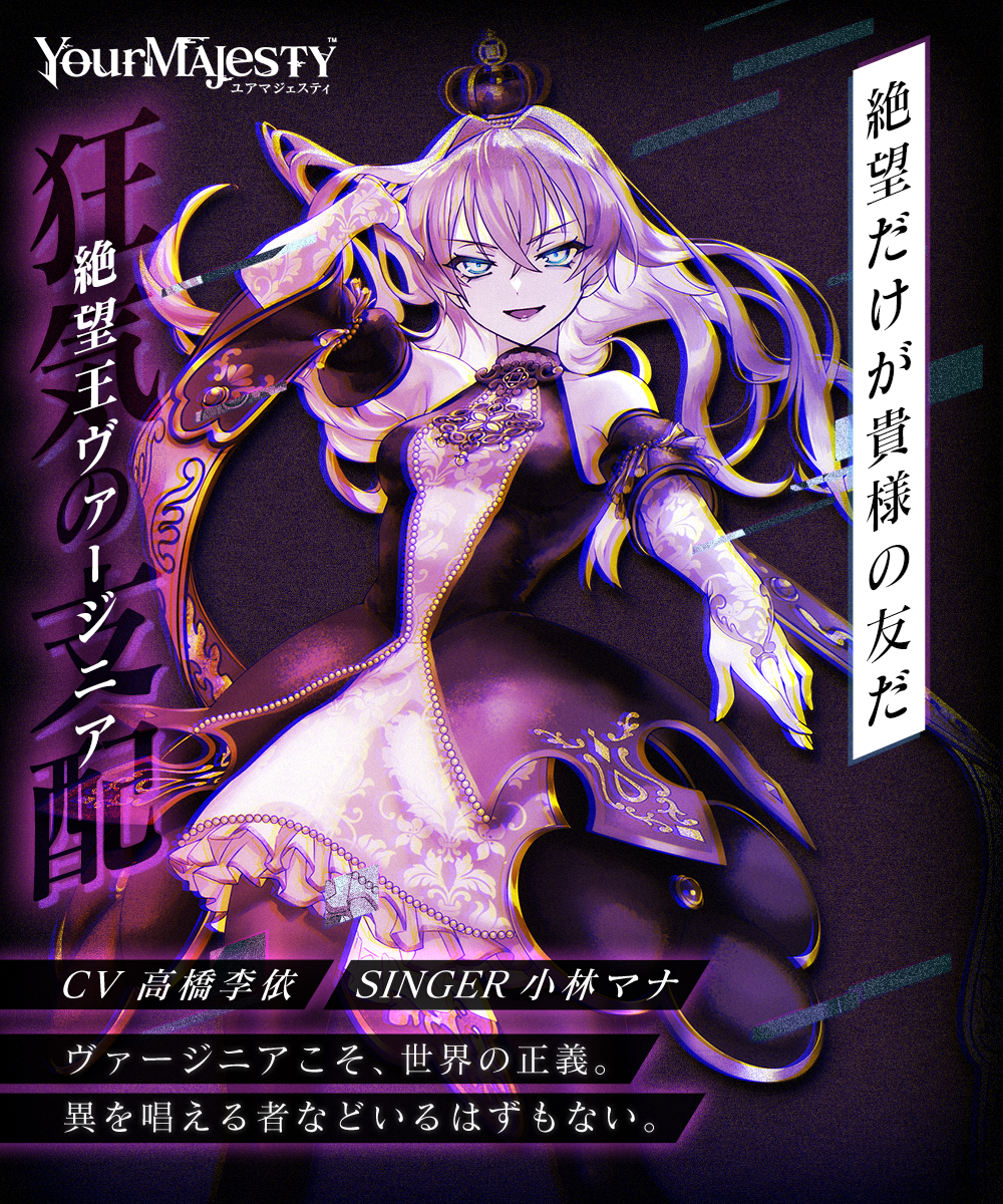 『ユアマジェスティ』に登場する24名の「王」のうち、メインテーマ『Pledge of Gold』を歌唱したキャラクターでもあるヴァージニア(CV:高橋李依/SINGER:小林マナ)とクロード(CV:伊東健人/SINGER:大山真志)の「正義」と「狂気」の新たなキャラクタービジュアルを発表いたします。