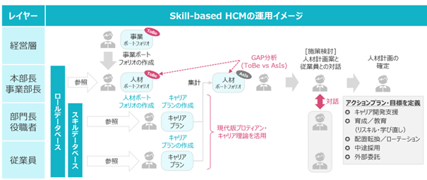 経営層やマネジメント層はスキルとロール(役割)をもとに事業戦略に応じた人材ポートフォリオを作成し、従業員はスキルとロールをもとにキャリアポートフォリオを作成します。
