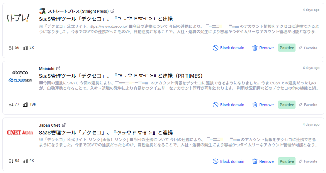 ・単にニュースを収集するだけでなく、推定リーチや権威性スコア、被リンクの有無を調査できる