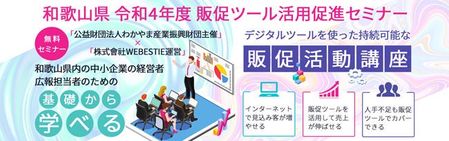 わかやま産業振興財団主催、株式會社WEBESTIEの運営でおこなわれる、SNSなどの販促ツールを活用したマーケティングについて、総合的かつ段階的に学べる全16回のセミナーです。参加対象者は、和歌山県内の経営者や個人事業主、広報担当、経営企画担当の方々です。