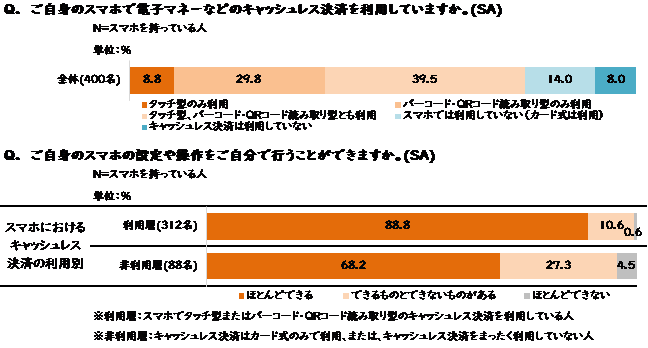 スマホ保有者のうち78.0%がスマホでキャッシュレス決済を利用(=利用層)しており、22.0%は非利用層であることがわかりました。スマホの設定や操作に関して上記の利用層と非利用層を比べると、自分で「ほとんどできる」と回答したのは、利用層では88.8%でしたが、非利用層では68.2%にとどまりました。利用層に比べて非利用層には、スマホの設定や操作が得意でない人が多く、そのことがスマホへのキャッシュレス決済アプリの導入を妨げる一因となっています。