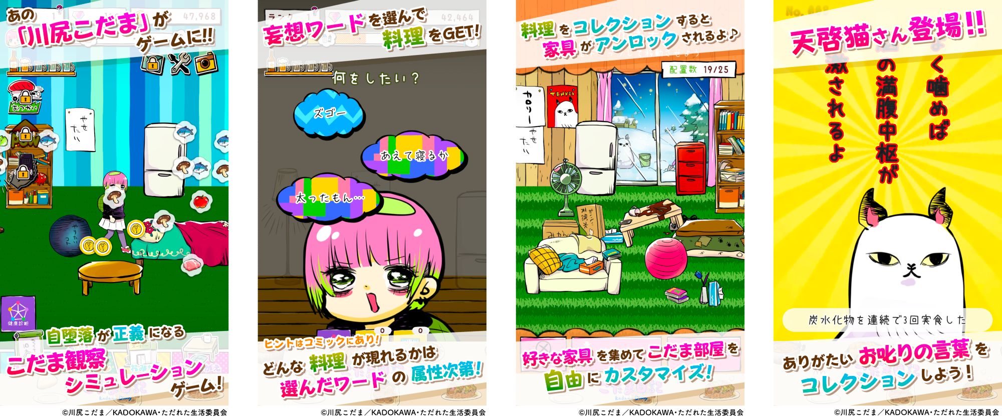 選択した妄想ワードの組み合わせに応じて出現する妄想料理をこだまに与え続けて、こだまの自堕落生活を助長するゆるく遊べるシミュレーションゲームです。