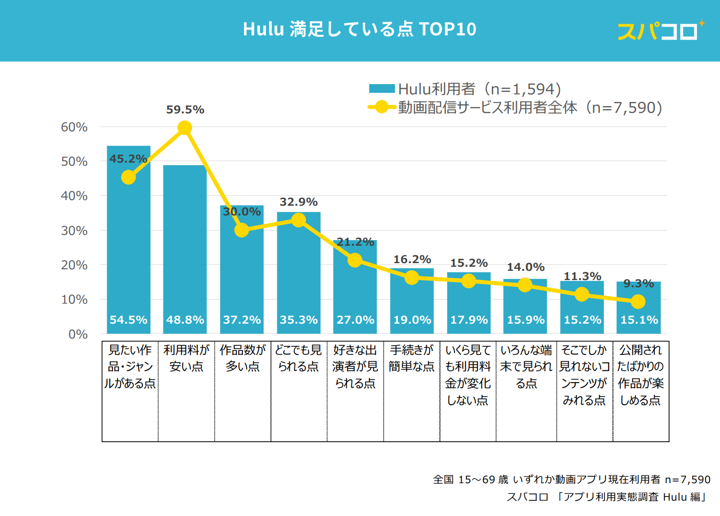 動画配信サービス利用者全体と比較すると「利用料が安い点」ではHuluのポイントが10ポイント以上低く、「見たい作品・ジャンルがある」から利用している人が多いと言えます。