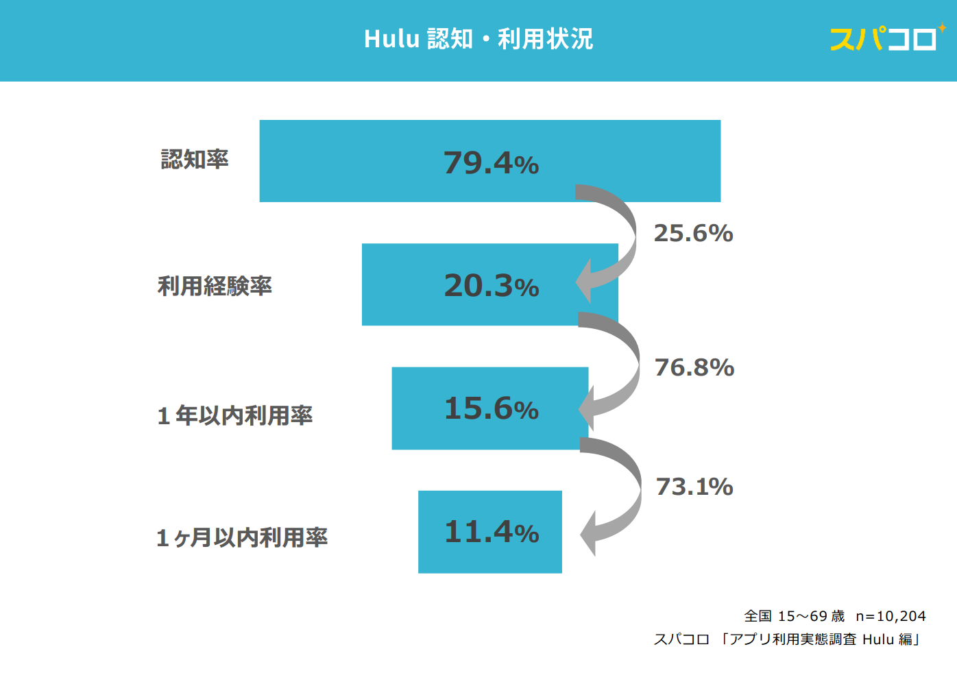 全国在住の15~69歳の10,204人に聞いたHuluの認知利用状況については、認知率が79.4%、利用経験率は全体の20.3%、1年以内利用率が15.6%、1ヶ月以内利用率が11.4%でした。