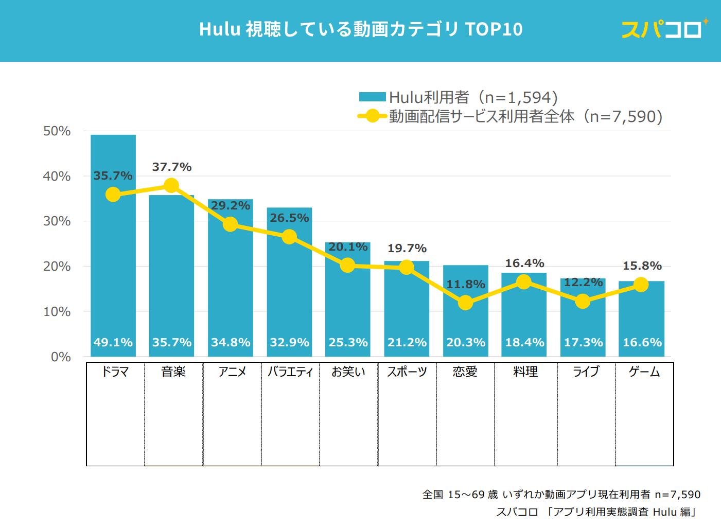 動画配信サービス利用者全体と比較すると、Hulu利用者は「ドラマ」「アニメ」「バラエティ」「お笑い」などで視聴している割合が高いことがわかります。