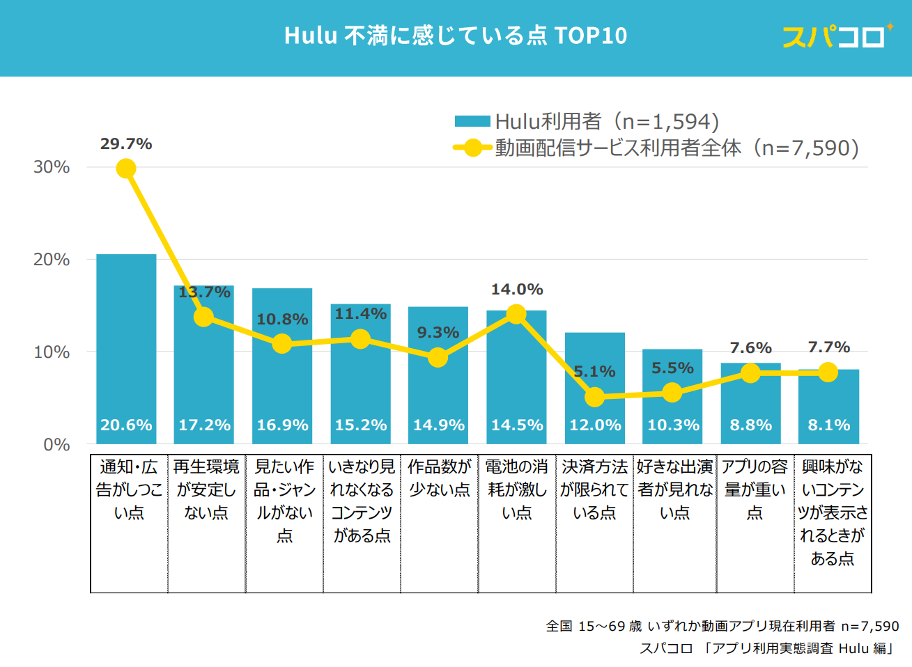 Hulu利用者が不満に感じている点は、上位から「通知・広告がしつこい」(59.4%)、「再生環境が安定しない点」(17.2%)、「見たい作品・ジャンルがない点」(16.9%)が続く結果となりました。
