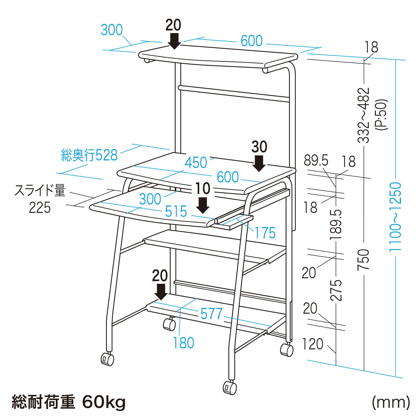 上棚は耐荷重20kgでプリンターなどの設置におすすめです。また、置くものに合わせて高さを調節することもできます。