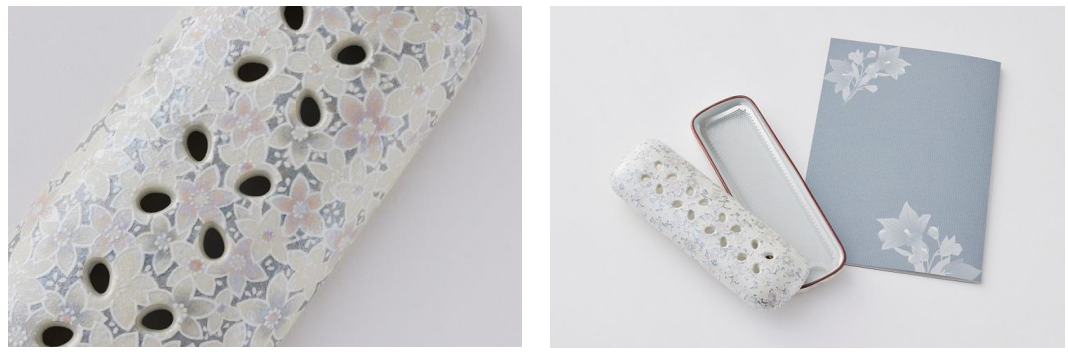 線香皿とオリジナル電文入れをセットでお届けします。線香皿は、落ち着いた色合いで、優美で気品ある雰囲気が漂います。オリジナル電文入れは、グレーを基調に、落ち着いた淡い色の小花の柄が散りばめられたNTTオリジナルのカラーです。(線香皿サイズ:3.6×19.8×6.5cm)