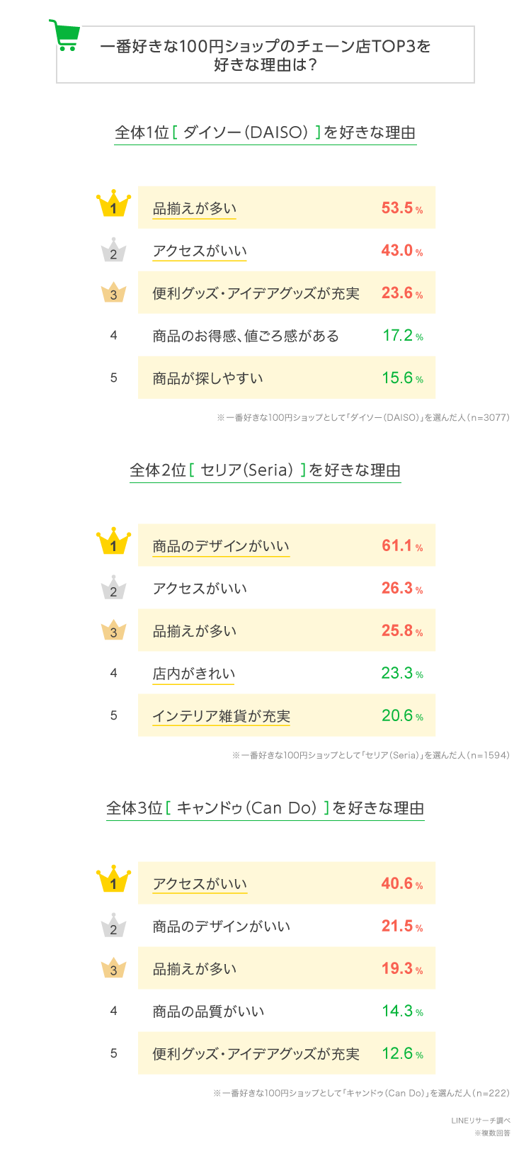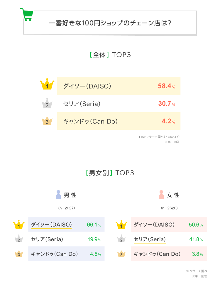 このたびLINEリサーチでは、日本全国の男女を対象に、一番好きな100円ショップのチェーン店やそのチェーン店を好きな理由について調査しましたので、結果をお知らせいたします。