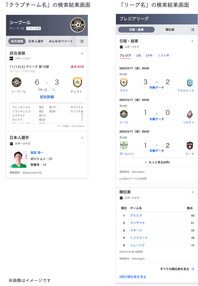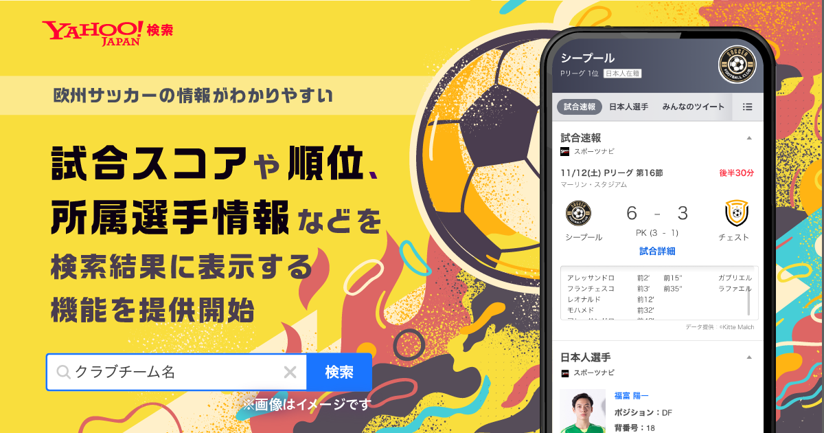 ヤフー株式会社(以下、Yahoo! JAPAN)は、「Yahoo!検索」(※1)で欧州サッカーのリーグ名称、クラブチーム名称(※2)を検索すると試合結果や順位、所属選手情報などを検索結果に表示する機能の提供を開始しました。