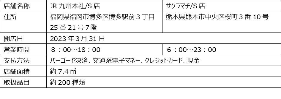 株式会社ファミリーマート(本社:東京都港区、代表取締役社長:細見研介)は、株式会社TOUCH TO GO(本社:東京都港区、代表取締役社長:阿久津智紀)が開発した無人決済システムを導入した実用化店舗の九州地方における初出店として、九州旅客鉄道株式会社の施設内に「ファミリーマートJR九州本社/S店」(住所:福岡県福岡市博多区博多駅前3丁目25番21号7階)と、九州産交ランドマーク株式会社が運営する商業施設「SAKURA MACHI Kumamoto」に「ファミリーマートサクラマチ/S店」(住所:熊本県熊本市中央区桜町3番10号)を、2023年3月31日(金)にオープンいたします。