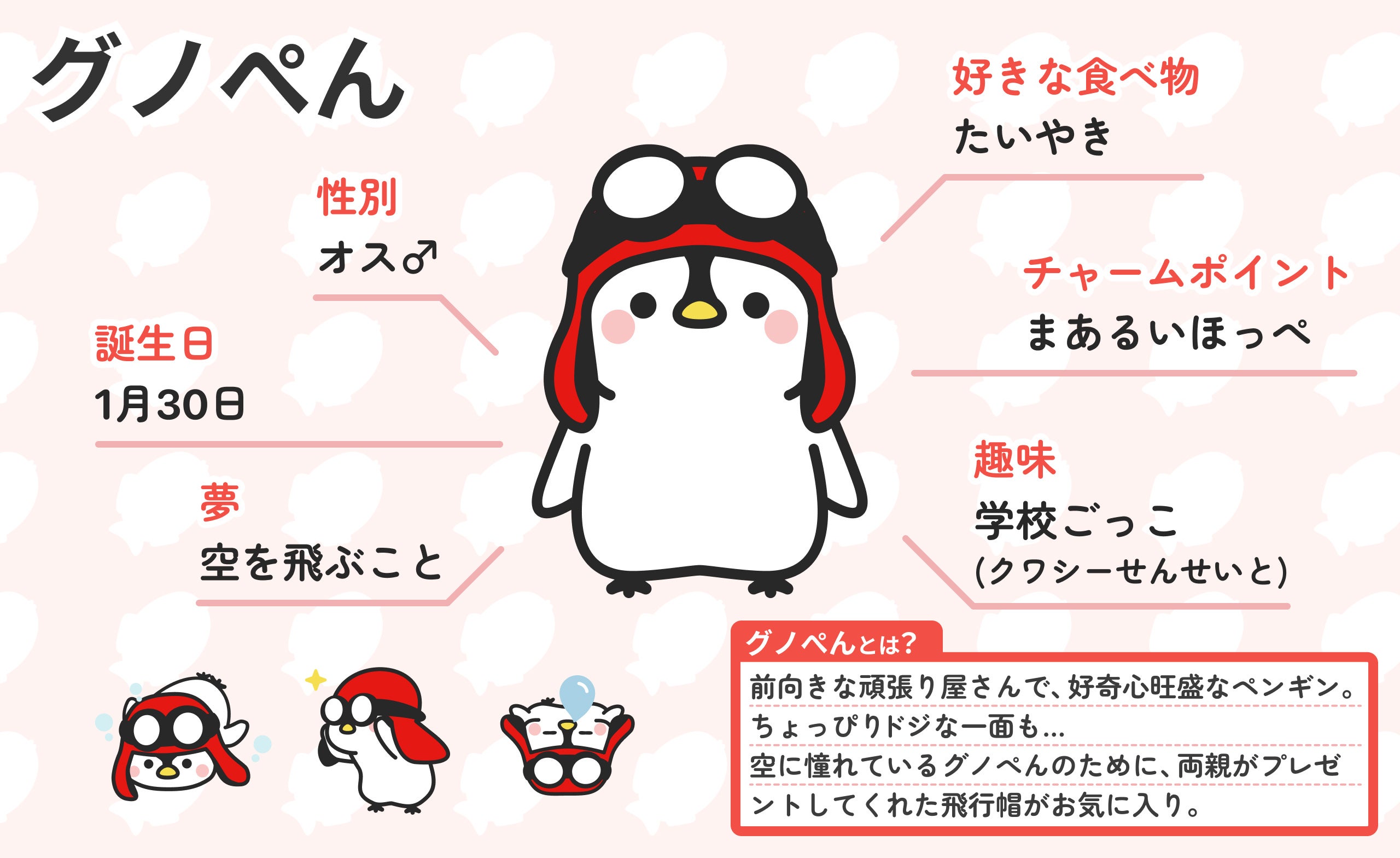 グノシーのロゴである紙飛行機と一緒に空を飛ぶことに憧れている前向きなペンギン