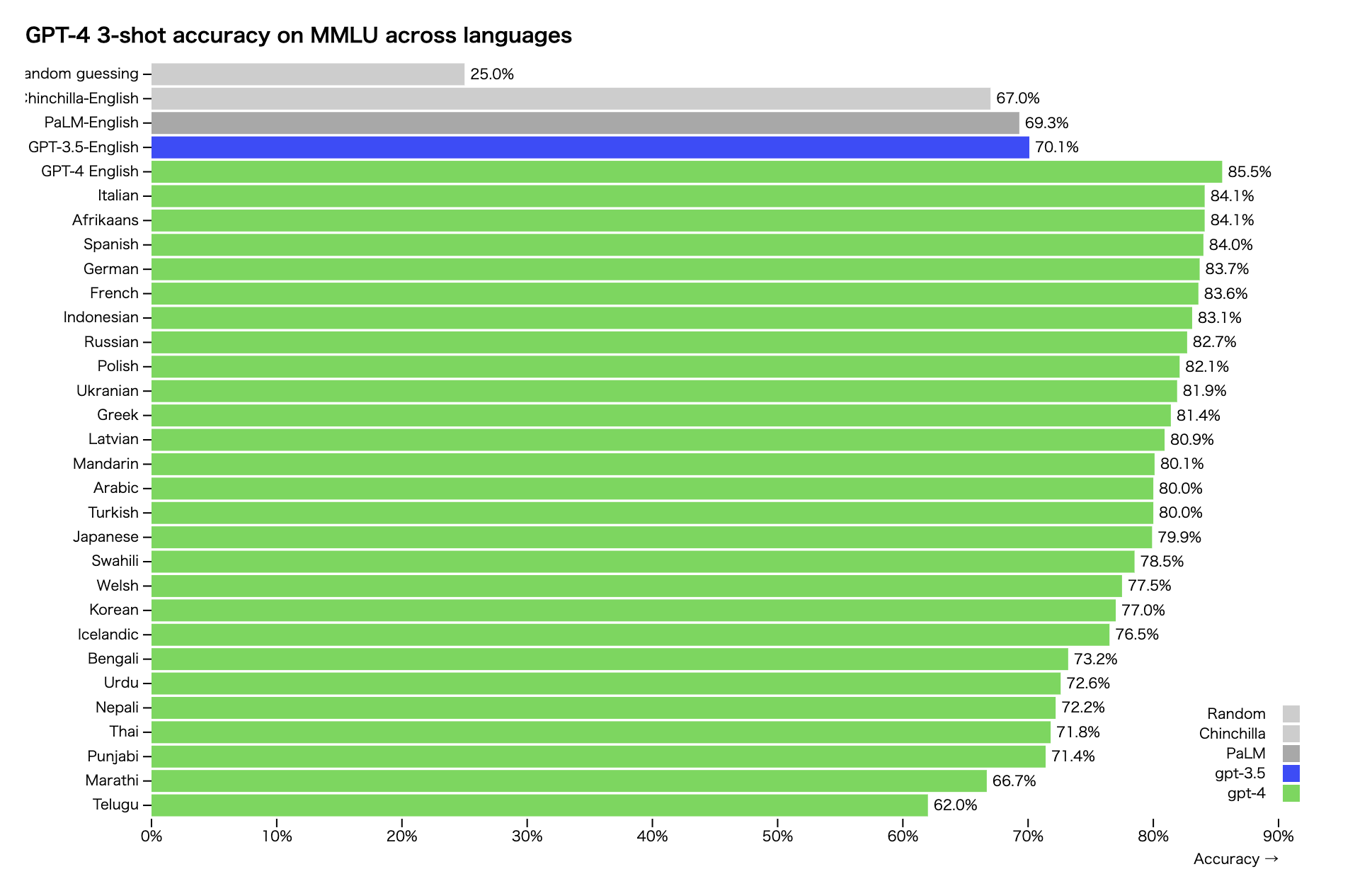 GPT-3.5(ChatGPT)と比較すると、様々な観点で精度が向上しており、たとえば日本語の精度においても、GPT-3.5(ChatGPT)においてはデータ量の関係で英語よりも日本語の精度が劣っておりましたが、GPT-3.5の英語よりもGPT-4の日本語のほうが精度が高い