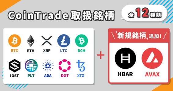 これにより「CoinTrade(コイントレード)」では、ビットコイン、イーサリアム、リップル、ビットコインキャッシュ、ライトコイン、パレットトークン、アイオーエスティー、ポルカドット、カルダノ、テゾスに加え、アバランチ、ヘデラの全12種類の暗号資産を取扱うこととなります。