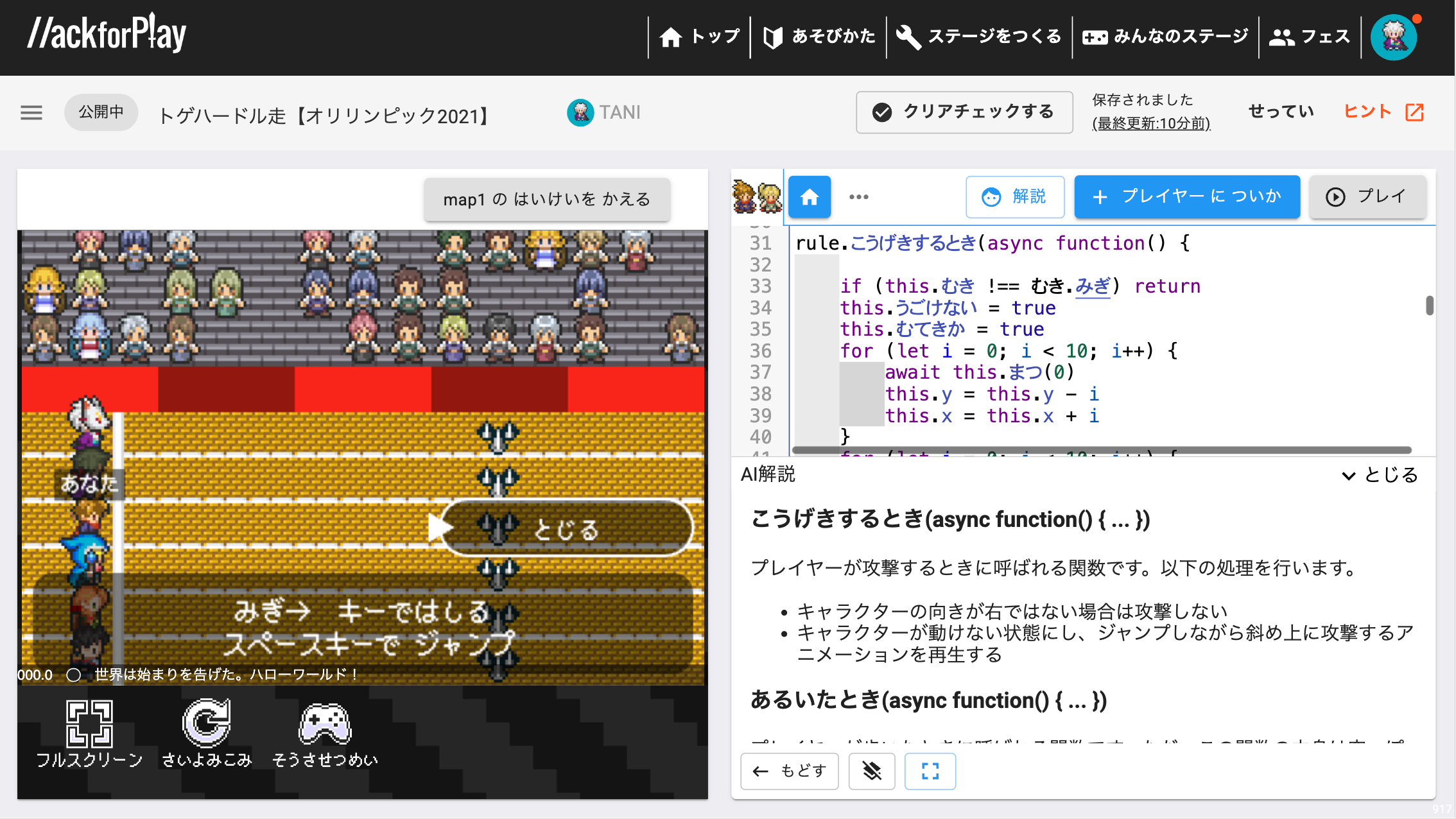 HackforPlayは、子どもたちや初心者がプログラミングを楽しく学べる無料のWebプラットフォームです(一部有料機能あり)。オンライン上で簡単にゲームを作成することができ、プログラミングを学びながら、クリエイティブな表現力や論理的思考力を養うことができます。