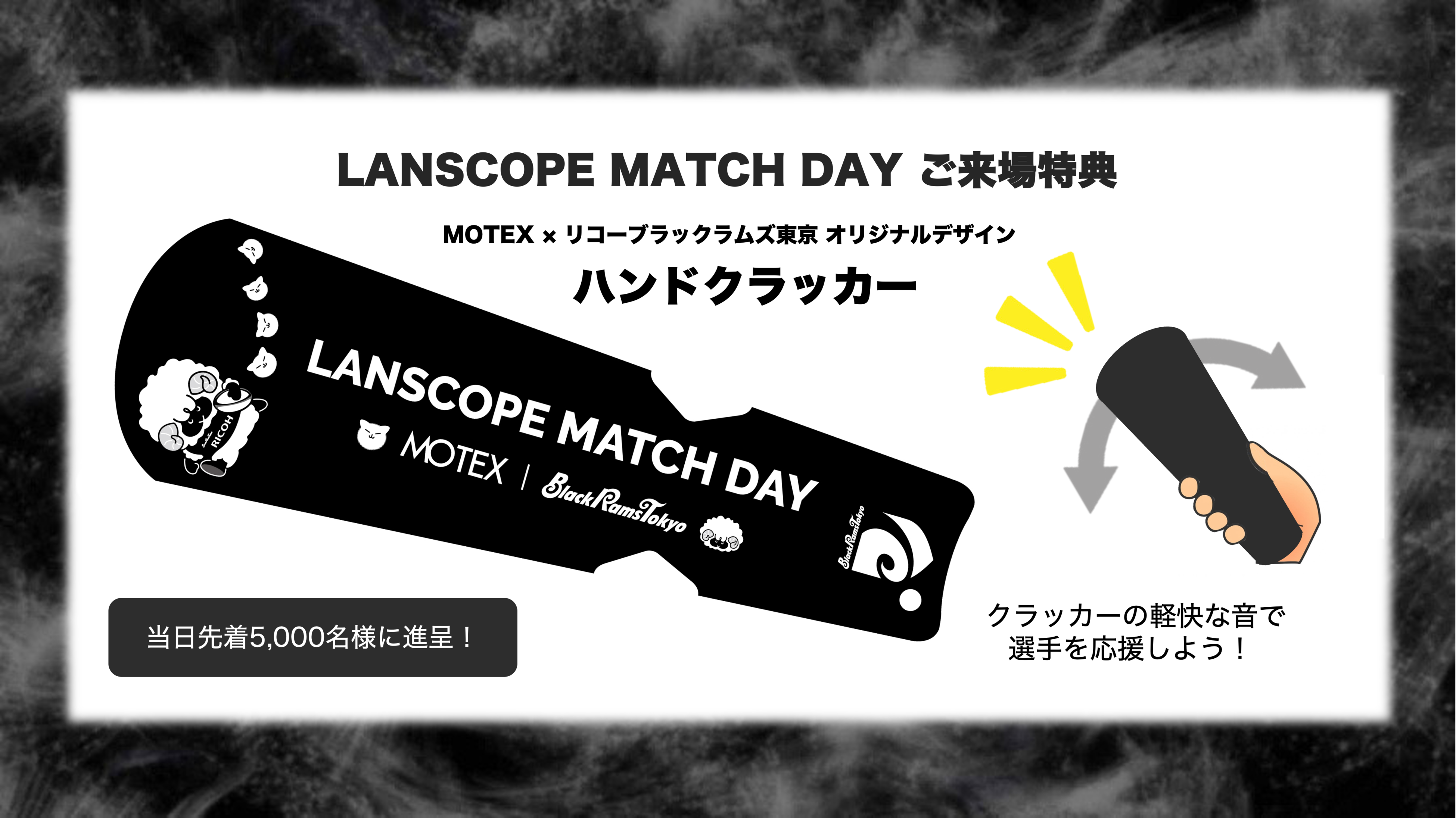 | 来場特典 | ご来場の先着5,000名様にオリジナルノベルティ 「MOTEX×リコーブラックラムズ東京オリジナルデザイン ハンドクラッカー」を進呈予定 |