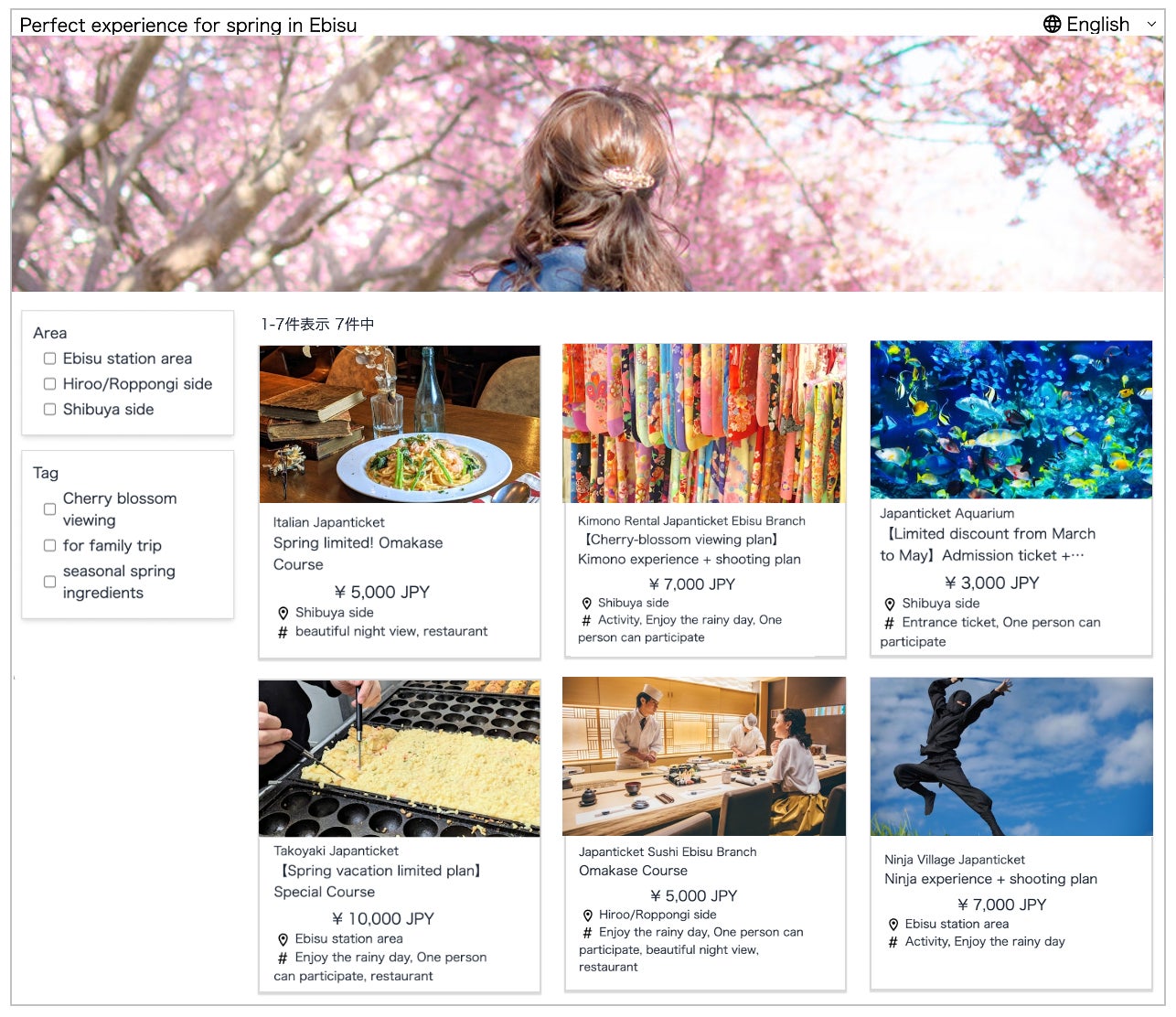 「Japan ticket prime」は、地域の観光事業者が提供する観光コンテンツを一元化してPRすることで、訪日観光客を誘客できるシステムです。