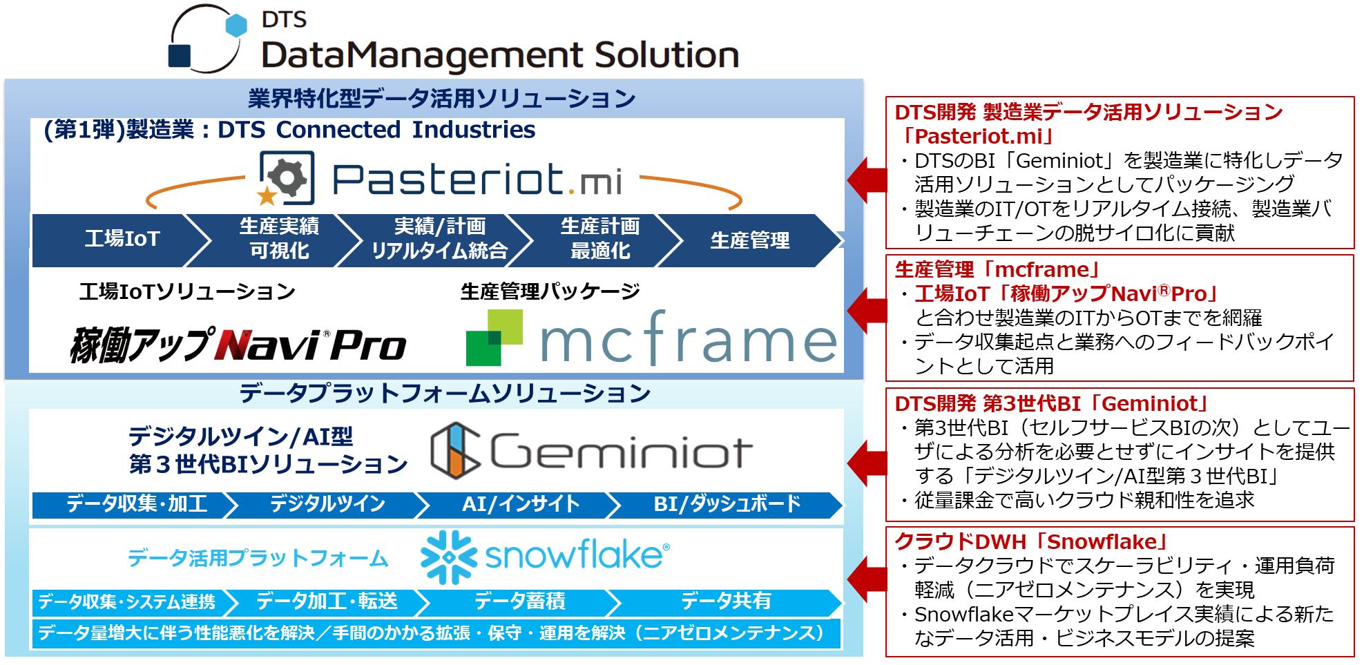 DTS DataManagement Solutionは、今後のDTSのデータ活用ソリューションの方向性を具体的な形にしたソリューションです。データ活用のキーテクノロジーとなるデータプラットフォームソリューションと製造業特化型データ活用ソリューションDTS Connected Industriesをそれぞれ深化・発展させつつ、他の業種・業界に向けても同様のフレームワークで業界特化型データ活用ソリューションを順次提供していきます。