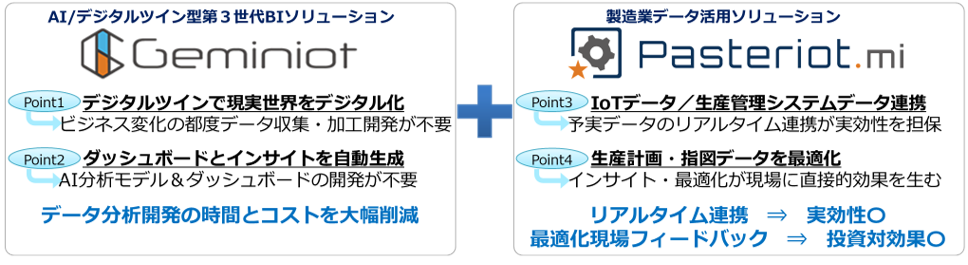 製造業データ活用ソリューションPasteriot.miは、Geminiotをコア機能として、製造業向けのIoTデータ入力インタフェース、生産管理システム連携機能をパッケージングしています。IT(インフォメーションテクノロジー)とOT(オペレーションテクノロジー)のデータを一元管理し、AIがインサイトを導き出し生産管理システムを通して現場にフィードバックすることで、実効性・投資対効果の高い製造業DXを実現します。