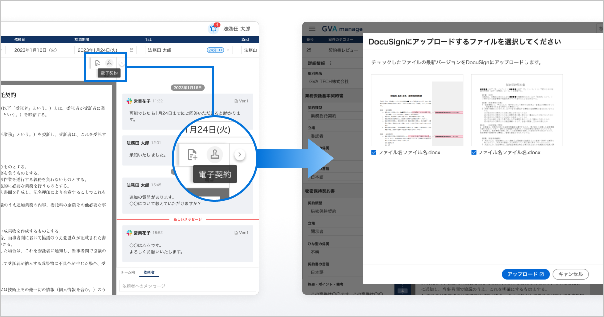- 法務部がGVA manageの「電子契約」ボタンをクリックして、6で確定した締結する契約書ファイルをドキュサインに連携