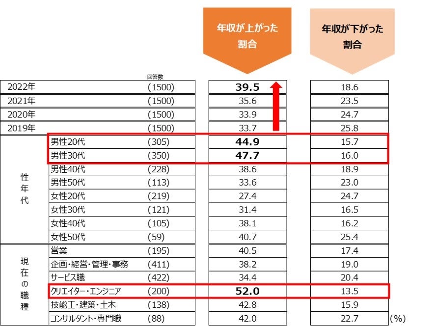 転職後の年収については、年収が上がった割合が全体のうち39.5%で、2019年以降増加した。性年代別では男性20代、30代が約半数の割合で上がっており、職種別では「クリエイター・エンジニア職」で増加した割合が高くなった。【図4】