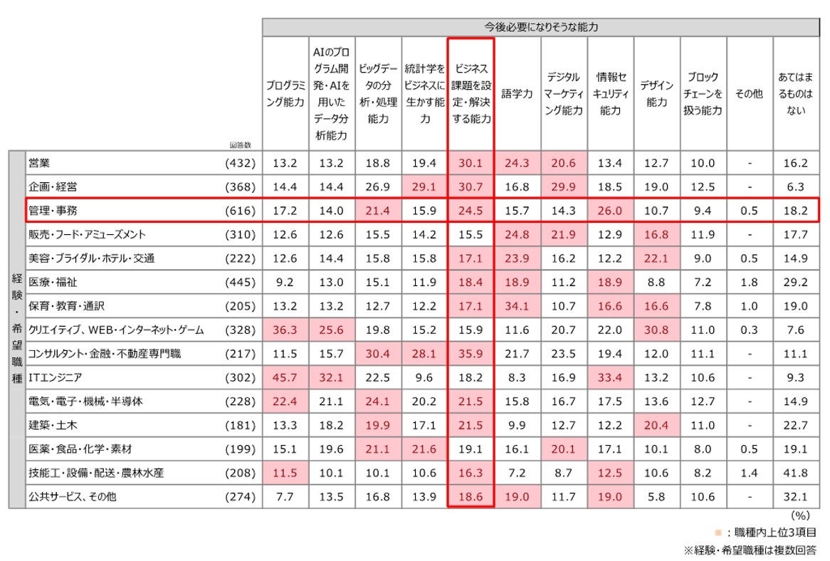 今後リスキリングが必要になりそうな職種は、「管理・事務」が25.1%で最も高く、次いで「医療・福祉」が21.0%、「営業」が18.7%となった。実際に「管理・事務」職種を経験または希望している人が、今後必要だと考えられる能力は「情報セキュリティ能力」で26.0%。次いで「ビジネス課題設定・解説する能力」が24.5%、「ビッグデータの分析・処理能力」が21.4%と続いた。