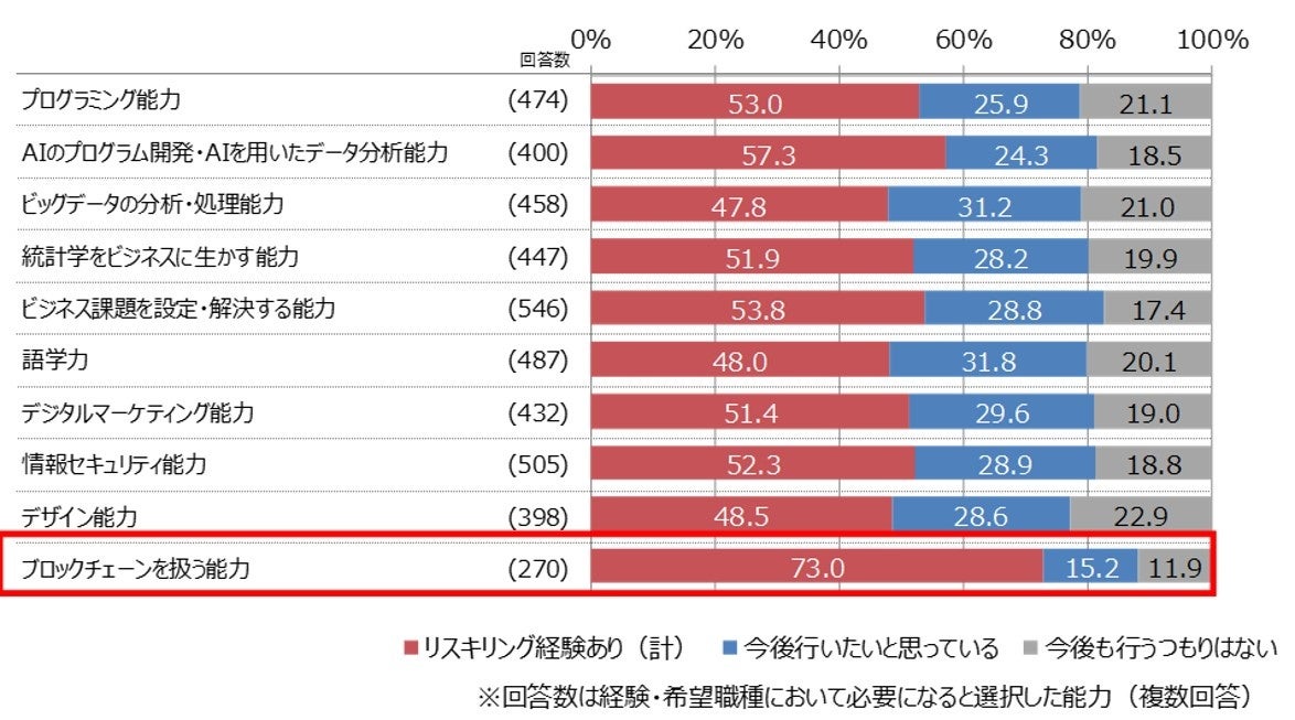 自身の経験・希望職種で必要になると答えた能力で、実際にリスキリングをしたかを聞くと、「ブロックチェーンを扱う能力」が最も多く73.0%、その他の能力においても約半数がリスキリングを行ったと回答した。また「今後行いたいと思っている」人も多く、経験がある人・今後行いたい人合わせて8割以上がリスキリングに前向きな姿勢を見せている。経験・希望職種について必要になりそうな能力がわかっている人はリスキリングに積極的であると考えられる。【図7】