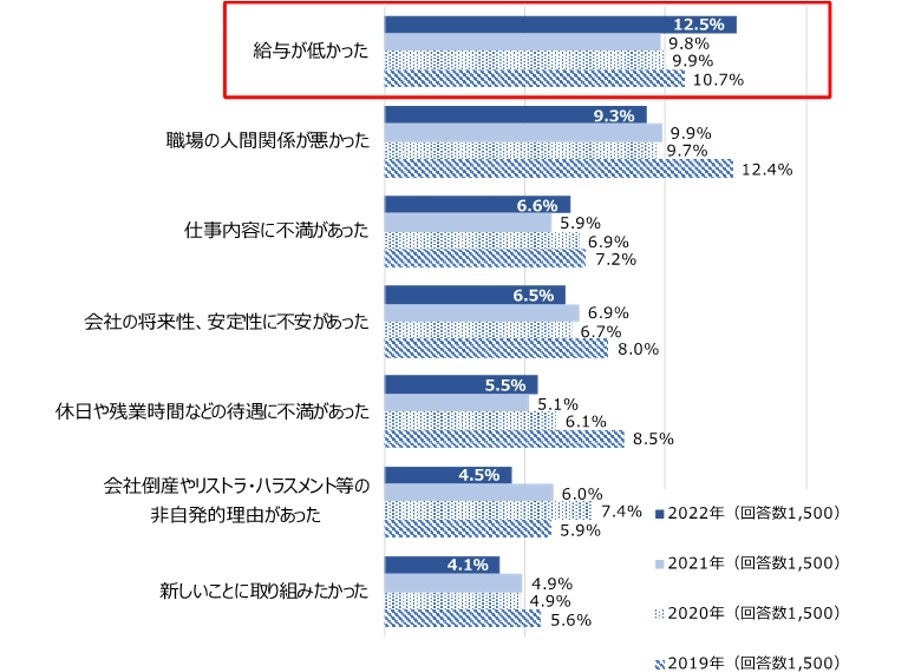 転職活動を始めた理由(単一回答)は、「給与が低かった(12.5%)」「職場の人間関係が悪かった(9.3%)」「仕事内容に不満があった(6.6%)」の順に多かった。上位項目は2019年以降同様だが、「給与が低かった」は2021年から2.7pt増加した。物価上昇により現状の給与への不満が高まったことが要因として考えられる。