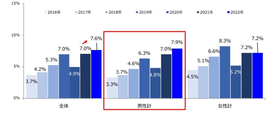 2022年の20~50代正社員の転職率は7.6%で、前回(7.0%)から上昇した。2016年以降で最も高い水準となり、転職活動が積極的に行われていたことがうかがえる。また、男女別にみると、特に20~40代男性は、過去7年間で最も高い転職率となった。【図1】