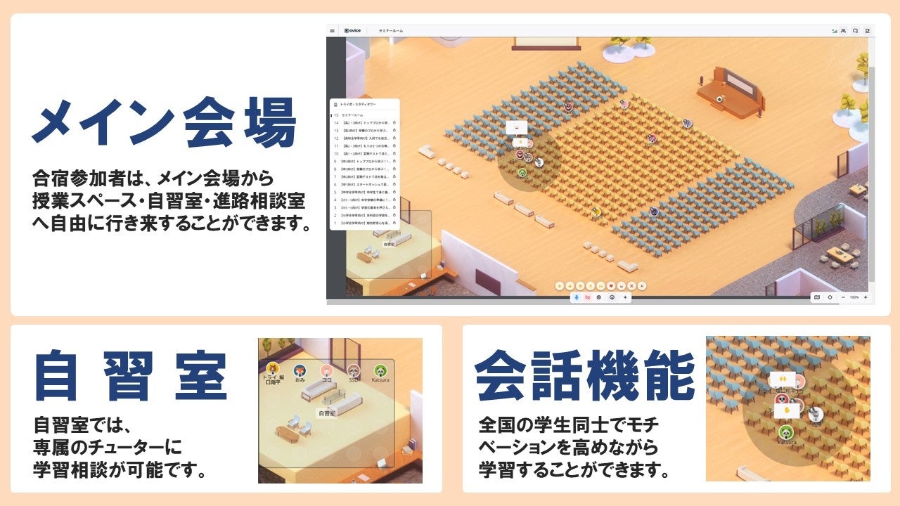 トライグループは「新学年の不安をゼロにする!全140コマの2日間集中授業」をコンセプトとし、全国どこからでも受講していただける「トライ式 春の全国オンライン合宿」を開講いたします。毎年、春夏秋冬に実施してきたトライ式合宿を、今年は新たにメタバースで実施。生徒は、会場内の授業スペース、自習室、進路指導室を自由に行き来できるため、自分の目標に合わせて主体的に学ぶことができます。また、会話やスタンプ機能を活用することで、授業中にリアクションしたり、全国の学生同士でモチベーションを高め合いながら学習することも可能です。オンラインでもオフラインに近しい「空間」「距離」で臨場感をもって楽しく学べる、新たな学習空間のカタチです。