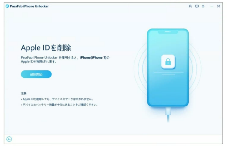 Step1:PassFab iPhone Unlockをパソコンにダウンロードして起動し、「Apple IDを削除」をクリックします。