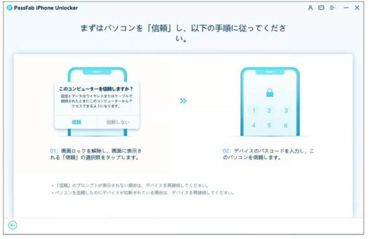Step2:iPadをパソコンに接続します。接続中のパソコンを「信頼」します。