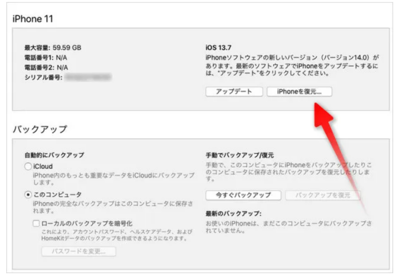 Step2:「概要」を開き、「iPhoneを復元」をクリックします。